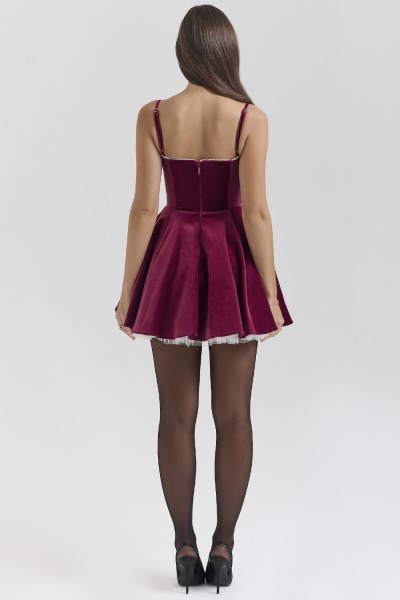 $89.70FREE DELIVERY ON YOUR ORDER Description Meet ‘Minimoiselle' in our spectacular seasonal velvet. She's a sumptuous burgundy-hued mini dress that’s ready to steal the spotlight and turn every occasion into a soirée. This stunning piece features a cupped corseted bodice, perfectly sculpted to hug your curves and enhance your silhouette,…