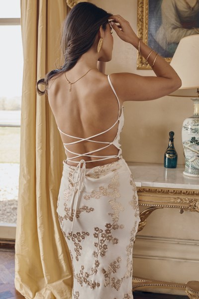 Fluid and languid, 'Capriana' just drapes across your form to create the most elegant of silhouettes. It's decorated top to toe with glimmering golden florals and the barely-there straps criss cross to delicately trace your back.