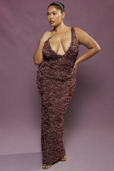 Carena Merlot Plunge Floral Appliqu?? Maxi Dress