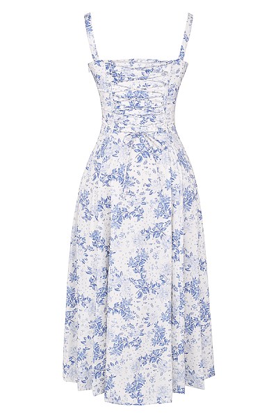 You'll feel ultra feminine in our 'Carmen' dress that's the perfect match for spring and summer garden parties. It's cut from stretch cotton in a gorgeous blue print hue and has a corseted bodice to cinch the fit with a beautiful lace up back. The gathered bust has a drawstring tie and the side split adds a little sexiness to reveal a flash of leg.
