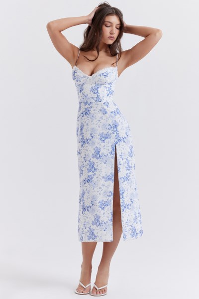 What feels more like spring than a pretty floral dress. Cut from our lightweight crepe that hangs beautifully, 'Charlotte' has a blue print that's even more beautiful close up with a flattering sweetheart neckline, edged in delicate lace and the bodice is fitted with our signature corsetry boning for a tiny, cinched waist.