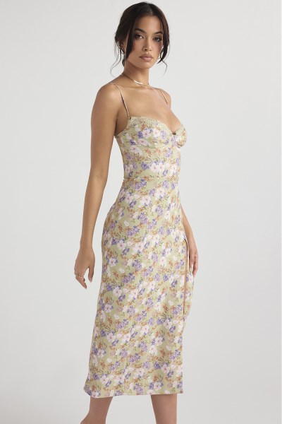 What feels more like summer than a pretty floral dress. Cut from our lightweight crepe that hangs beautifully, 'Charlotte' has a peony print that's even more beautiful close up. It has a flattering sweetheart neckline, edged in delicate lace and the bodice is fitted for a tiny, cinched waist. The shoulder straps adjust for the perfect fit and we love the daring side split to add a little sexy to the vintage style. It has a zip to the back for easy on and is fully lined for comfort. Wear yours with our 'Lucent' mules for champagne garden parties. The 'Regular' cup option suits cup size A-C whilst the 'Bigger' cup option suits cup size D-E.