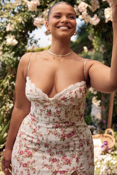 What feels more like summer than a pretty floral dress. Cut from our lightweight crepe that hangs beautifully, 'Charlotte' has a rose print that's even more beautiful close up with a flattering sweetheart neckline, edged in delicate lace and the bodice is fitted with our signature corsetry boning for a tiny, cinched waist. The shoulder straps adjust for the perfect fit and we love the daring side split to add a little sexy to the vintage style. It has a zip to the back for easy on and is fully lined for comfort. Wear yours with our 'Lola' mid heels in white for champagne garden parties. The 'Regular' cup option suits cup size A-C whilst the 'Bigger' cup option suits cup size D-E.