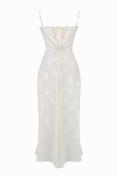 'Seren' is perhaps our most romantic dress yet and we're loving the corset inspired lace up back for a vintage feel. It's cut from a luxurious textured Jacquard in a vintage cream, embellished with floral blooms. 'Seren' features a delicate rouleau shoulder straps.