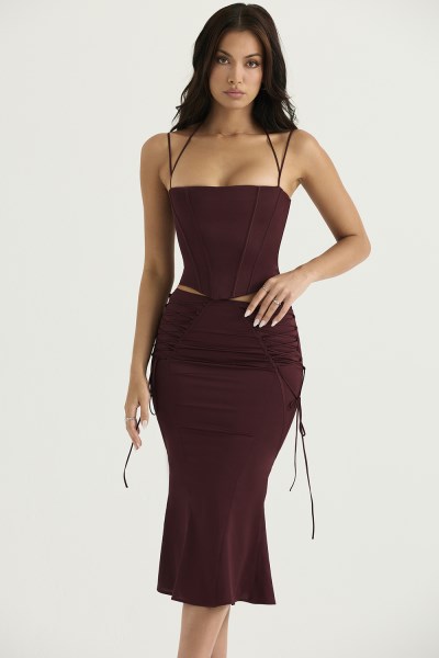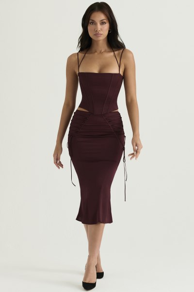 Our 'Sidonie' skirt is cut from the softest fluid satin in a wine hue that creates a beautiful drape from the knee. 'Sidonie' sits on the high hip for a flattering and comfortable feel and we especially love the lace up detail to the front for an ultra feminine touch. It has a zip to the back for easy on and is fully lined for comfort. Wear yours with our 'Chantelle' corset in wine to match the fit and dainty heels.