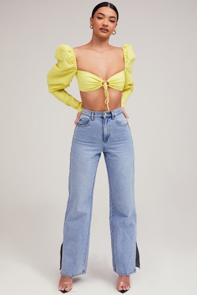 Pretty and chic are two concepts that blend beautifully into our spring collection and 'Tough Love' brings fresh citrus tones in a vibrant lemon. It is cut from our crisp and fresh cotton and has feminine puff sleeves that frame the sexy bralette style top with a keyhole front and drawstring ties to pull in for a popping fit and boost your cleavage.