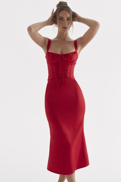 Our 'Valencia' dress has an ultra feminine red rose hue that's the perfect match for romantic date nights. It's cut from our luxurious duchess satin and has a gorgeous silhouette. The bodice features internal boning to the side seams and an outer corset to really cinch the fit with a beautiful lace up front. The flattering gathered bust has a drawstring tie, framed by adjustable straps and we love how the close fit through the body flares out to a floaty midi hem.