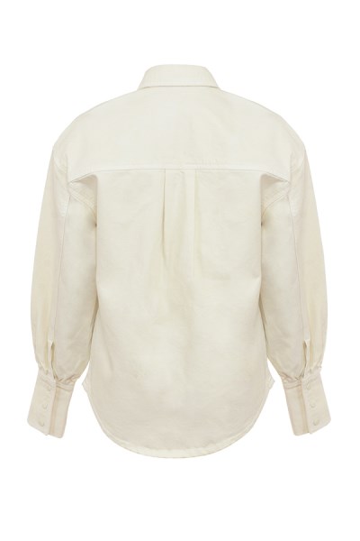 Inspired by slightly masculine styles, our 'Zuri' shirt is made from ivory denim and the loose fitting shape means it's the kind of style you can throw on over a vest or tee. It fastens to the front with popper buttons, topped with an exaggerated collar and has deep cuffs. Wear yours with our 'Marli' jeans for a denim on denim vibe.