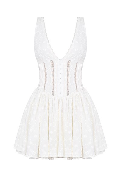 $76.50FREE DELIVERY ON YOUR ORDER Description Our 'Sarita' mini dress is cut from airy white cotton-rich broderie anglais, making it perfect for warmer weather. It has dainty scalloped trims and a plunge neckline. The close fitting bodice has hook and eye detailing to the front and the pretty panels reveal…