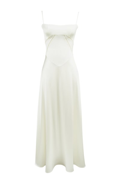 FREE DELIVERY ON YOUR ORDER Description 'Anabella' is perhaps our most elegant dress yet and the epitome of luxurious event dressing. Cut from a lustrous ivory silky satin for a fluid drape, 'Anabella' features a flattering neckline with delicate rouleau shoulder straps.  The curved bodice hem sits just below the waist,…