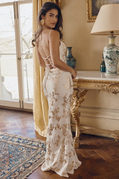 $98.70FREE DELIVERY ON YOUR ORDER Description Fluid and languid, 'Capriana' just drapes across your form to create the most elegant of silhouettes. It's decorated top to toe with glimmering golden florals and the barely-there straps criss cross to delicately trace your back. 'Capriana' zips to the side for easy on.…