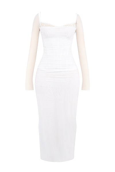 $76.50FREE DELIVERY ON YOUR ORDER Description Our gorgeous 'Katarina' dress is back this season in a classic white hue that sets the tone for your most glamorous events. It features a figure cinching boned bodice with the prettiest lace trim peeking from the neckline. The ultra feminine fit falls effortlessly…