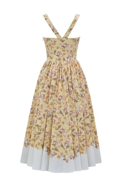 Our 'Alba' midi dress with it's Autumnal Honeyflower print is perfect for this transitional season. The corseted bodice balances the voluminous, gathered midi skirt and the skirt is beautifully layered with a tulle underskirt. We love the V shaped straps at the back and 'Alba' has a working button front but zips to the side for easy on. Style yours with dainty kitten heels. By using digital printing techniques as opposed to other printing methods we have reduced water wastage using this process. WHERE TO WEAR:
