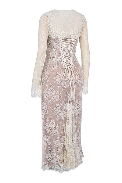 There's a sense of romance about our 'Artemis' dress. Beautifully made from exquisite, delicate lace and underpinned with our figure cinching cafe au lait power mesh, it features a corseted bodice that's gorgeously gathered with lace up detailing to the back.