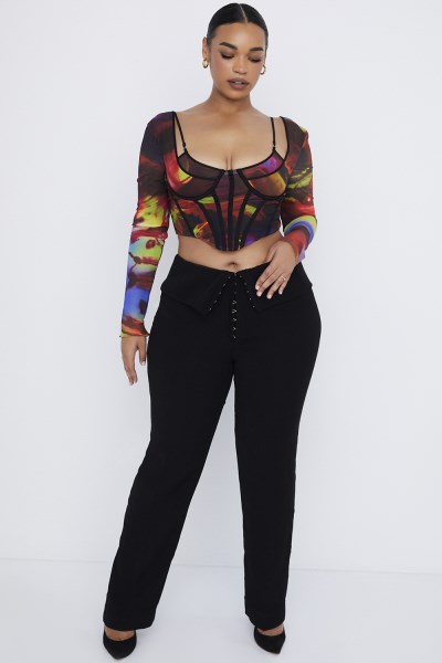 This elevated basic makes stylish Fall dressing super easy. Cut from a stretch crepe they have a distinctive fold front design with hook and eye details adorning the front. They sit at the natural waist and look equally as good with a cropped corset or a skinny knit turtle neck for more casual dressing. Fully lined for comfort, team yours with one of our Black Orchid collection corsets. Made from stretch crepe. Stretch Factor: 2/3 Designed by House Of CBSee more Trousers here Length: Approx 133cmInside Seam Length of Trousers: Approx 82mMaterial: Light Weight Crepe (100% Polyester) Satin (97% Polyester, 3% Elastane) Medium Crepe (95% Polyester, 5% Elastane)