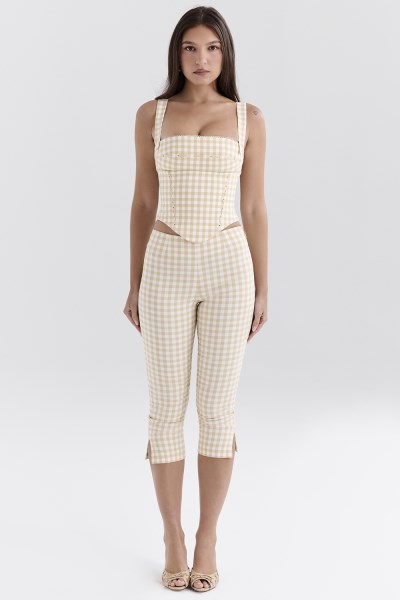Main – Gingham: 77%viscose, 21%polyester, 2%elastane Stretch Factor: Some Stretch Designed by House Of CBSee more Trousers here Length: Approx 78cmInside Seam Length of Ttrousers: Approx 55cmGentle Dry Clean Only