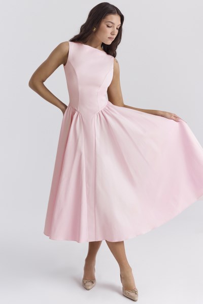 Our 'Cindy' dress has an elegant, effortless style that's inspired by our love for romantic designs. Made from soft peached Rayon twill, the gorgeous ballerina pink hue has a Spring-Summer feel that's perfect for dreamy destinations and pretty garden parties. The fitted bodice has a sleeveless silhouette and a subtle high neck that turns to reveal a dramatic open back. The romantic midi skirt falls beautifully to a floaty midi length and zips to the back for easy on. 'Cindy' is ultra wearable for warmer climates and we love yours paired with the dainty mules like 'Andromeda' in white. WHERE TO WEAR: