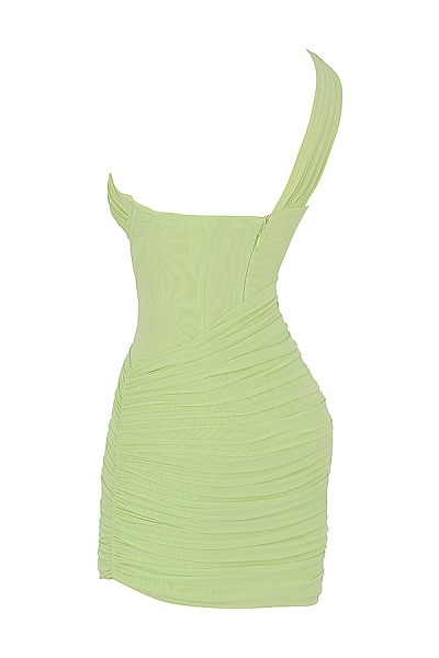 Our 'Clementine' dress is a beautiful way to tap into style. It's crafted from a soft power mesh in a tropical lime hue and backed in our special power mesh to sculpt and shape the figure from within, acting like shapewear that is cleverly built into the dress. The bodice features our amazing corsetry boning for a super cinching effect and the bust has built in underwired cups to escape the need for a bra as it has all the support you need. 'Clementine' is effortlessly chic as it sweeps across one shoulder in an asymmetric silhouette and spliced through the chest to reveal a hint of cleavage. We love the beautiful draping that extends from above the waist to the right side and down through the skirt to enhance the already body hugging fit to equally balance the asymmetric mini hem, baring plenty of leg. It has a zip to the back for easy on. Complete the ultra chic vibe with neutral heels like 'Lucent' Clear Strap Beige Suede Mules for those stylish date nights. The 'Regular Cup' option suits cup size A-C whilst the 'Bigger Cup' option suits cup size D-E.