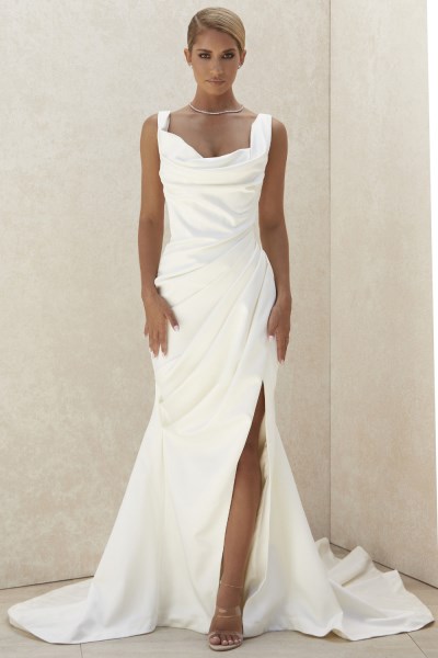 The most spectacular gown in our Debut collection, 'Delphine' is expertly crafted from our lustrous weighty Duchesse satin. It features incredible corsetry and draping to give second-to-none cinching and lift. The draped satin extends languidly from the bust around the shoulders to form sexy sleeves that can sit off shoulder or on or do like our designer intended with just one sitting sexily off shoulder. The clever draping extends down through the bodice and creates the most perfect hourglass silhouette. The leg baring front slit is super sexy as you walk down the aisle and Delphine finishes in a long langorous sweeping train for extra drama. Wear yours with the prettiest shoes to highlight your legs in this thigh slit style. Made from weighty Duchesse satin. Fully lined. Stretch Factor: 1/3 Designed For House Of CB