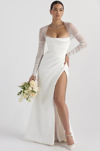 Our 'Elise' bridal gown is the definition of romance and will make you feel so confident and elegant on your special day. Hourglass-making corsetry, a subtle thigh split and the softest sheer sleeves combine to make this a truly beautiful dress. Wear Yours with our 'Simone' veil and 'Andromeda' mules in white.