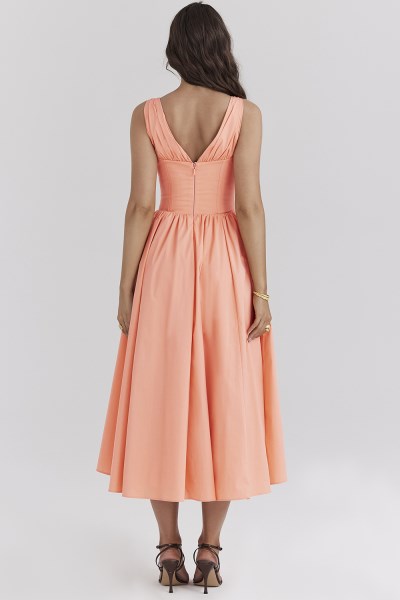Channeling understated elegance, 'Emmelina' is an effortless wear-anywhere style in a gorgeous sorbet hue. The cotton rich fabric is blended with stretch and beautifully designed with a gathered bust. The plunge neckline perfectly mirrors the open back and the bodice is corseted to cinch the waist. The floaty midi skirt swishes with every step, adding that ultra feminine feel and it zips to the back for easy on. 'Emmelina' will be your go-to dress from Spring through to Summer. Wear yours with tonal heels like 'Lola' in sunkissed. The 'Regular Cup' option suits cup size A-C whilst the 'Bigger Cup' option suits cup size D-E.