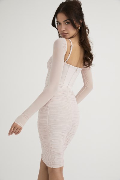 'Freyja' is tailored to hug your figure and perfect for glam parties and events. The bodice is cut from our lustrous duchess satin that's boned throughout to cinch your waist and has a gathered soft mesh overlay with a pretty low cut neckline. It has long fitted sleeves and adjustable shoulder straps. The skirt sits just above the knee and is cut from gathered soft mesh to flatter your curves and is backed in our special power mesh for a smooth, cinched in fit. It zips to the back for easy on. Wear yours with delicate heels like our 'Paris' heels in patent black. The 'Regular Cup' option suits cup size A-C whilst the 'Bigger Cup' option suits cup size D-E.
