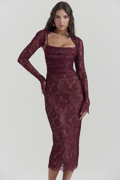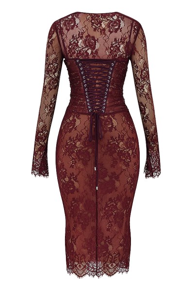It's easy to fall in love with our gorgeous 'Gaia' dress as the delicate lace and beautiful rich colouring make it feel extra special. Made from an exquisite, delicate, scalloped lace in deep Claret, 'Gaia' is underpinned with our figure cinching cafe power mesh in a neutral cafe-au-lait tone. Gaia features a corseted bodice that's gorgeously gathered with lace up detailing to the back.