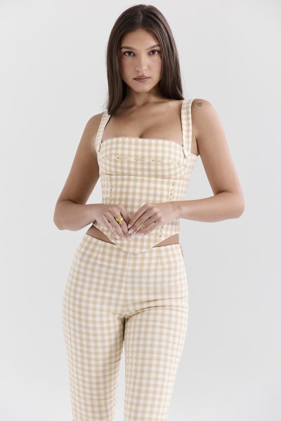 In a gorgeous gingerbread gingham, 'Lottie' is the prettiest corset that you're going to want to team your favourite jeans with. It's made from a luxurious airy viscose and the fitted, boned bodice cinches your waist. We adore the delicate contrast ribbon threaded throughout. 'Lottie' is easily our prettiest corset in this collection. It zips to the back for easy on.'Lottie' is made from luxurious airy viscose. The fitted, boned bodice cinches your waist and we adore the delicate contrast ribbon threaded throughout. 'Lottie' is easily our prettiest corset in this collection. It zips to the back for easy on.