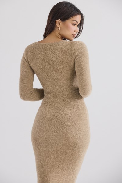 Our 'Lucille' dress is beautifully knitted from luxurious faux mink hair that is super soft to the touch and designed in a flattering curve hugging silhouette. It has long sleeves with a deep plunge neckline and the Camel hue is perfect for all seasons.