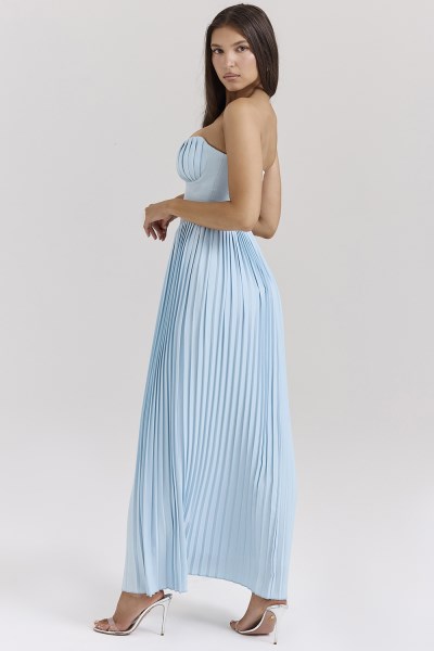 The ethereal oceanic beauty of 'Marcella' creates a dreamy and romantic feel. Cut from an ocean blue georgette, the bust features shell shaped pleats and beautifully define your décolletage. The bodice is perfectly boned to cinch the waist. The pleated maxi skirt flows elegantly, ensuring every step is truly mesmerising. Wear yours for those High Summer events and dinner dates.