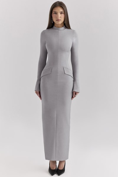 The 'Marie-Louise' dress is an ultra sculpting figure-forming maxi dress crafted from luxurious stretch crepe. Its dramatic long fluted sleeves bring a statement-making edge, while the back vent ensures ease of movement. We love the flap detail pockets. Finished with a zip-back design for effortless wear, this elegant piece is your perfect companion for modern sophistication. Made with Viscose, a natural fibre made from regenerated cellulose. Known for its smooth and luxurious properties. WHERE TO WEAR: