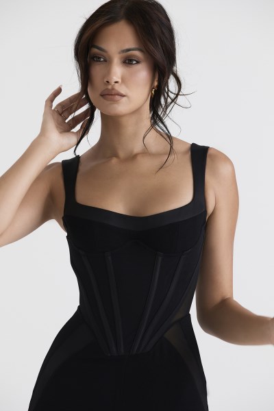 Made from stretch crepe, power mesh and satin. Fully lined bodice. Stretch Factor: 2/3 Designed For House Of CBCheck out more Jumpsuits here Length: Approx 152cmInside Seam Length of Trousers: Approx 83cmMaterials: Power Mesh, Medium Stretch Crepe, Single Duchess Satin, Stretch Satin