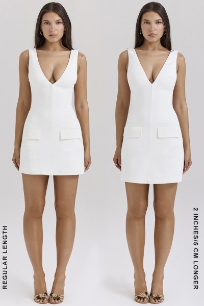 'Olympia' looks ultra chic paired with our 'Andromeda' mules in off white. Taller girls, we heard you and this is available in two lengths, our regular mini length and 2 inches / 5cm longer. Regular length: Approx 85cm and Longer: Approx 90cm.