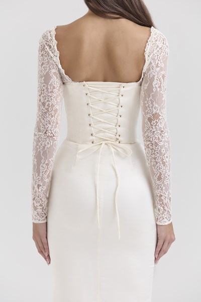 Step into a world of romance with ‘Perdi’, an exquisite satin maxi dress that captures the essence of timeless elegance. This breathtaking piece features a corseted bodice adorned with delicate lace cups, sculpting your figure into a stunning silhouette that exudes sophistication. The enchanting lace sleeves add a whimsical touch, while the intricately designed lace-up corset back ensures a perfect fit and a hint of allure. With a fitted silhouette that hugs your curves and a daring back split, this dress balances grace and boldness, allowing you to move with effortless elegance. Fully lined for your comfort, ‘Perdi’ is perfect for a range of occasions—from enchanting garden weddings to glamorous evening galas. With its captivating details and luxurious feel, this dress promises to make you the center of attention. And you can forget the fuss; this dress zips up the back for easy wear and feels just as sumptuous as it looks. For the perfect fit, our A-C cup girls will want to go for our ‘Regular Cup’ option, and our ‘Bigger Cup’ will best suit our D-E cup girls. WHERE TO WEAR: