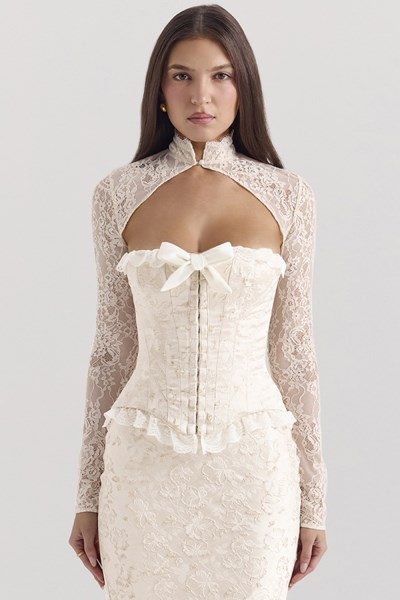Meet the 'Perdita' Ivory Metallic Jacquard Corset Top – a piece that’s all about opulence with a playful twist. This stunning corset top features luxurious metallic jacquard fabric, boning to sculpt your silhouette, and a pretty velvet bow at the center for that touch of charm. Designed with a hook-and-eye front fastening for an authentic corset look, but with a discreet back zipper for easy wear. And here’s the pièce de résistance: a detachable Chantilly lace bolero that adds a layer of romantic elegance and versatility. Perfect for those who love a little drama in their wardrobe, this corset top brings luxe and charm to any outfit. Team yours with the coordinating 'Mara' skirt as our designers intended or wear with your favourite jeans for that glam casual vibe.