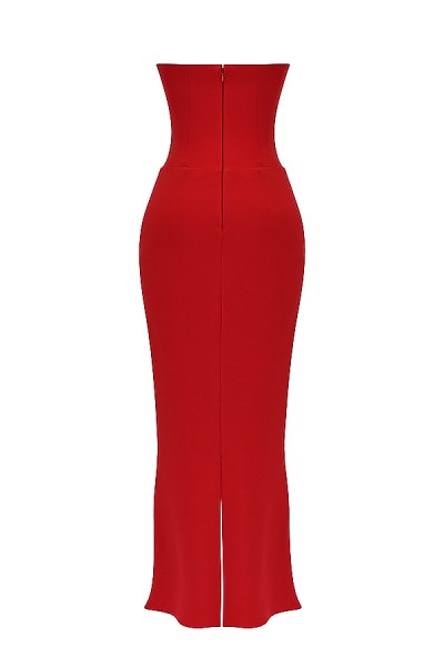 Glamorous, elegant and timeless are the three words that perfectly describe 'Tamara'. This stunning creation is cut from cherry stretch crepe with a strapless peaked neckline that showcases the bust and highlights your décolletage so beautifully.