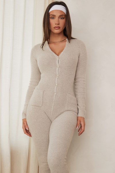 Our new lounge collection is all about everyday dressing and our 'Tiggy' jumpsuit is the perfect example. Cut from a luxuriously soft knit for a snug fit in a pull on style, 'Tiggy' has an ultra feminine button front to wear as open as you dare and the long sleeves and leg cuffs have a ribbed finish for the closest fit. The best thing? it even has pockets. We love this worn beneath a chunky knit cardigan like 'Celine' in chocolate for when date nights call for the perfect night in. We recommend folding our knitwear as it will stretch on a hanger.